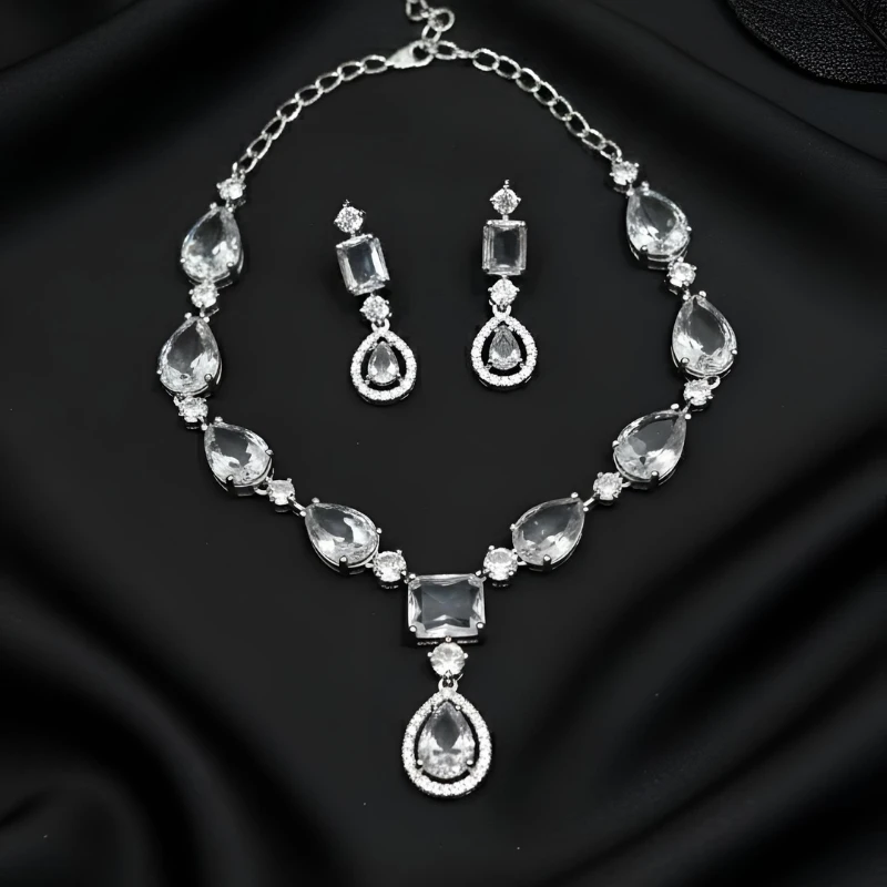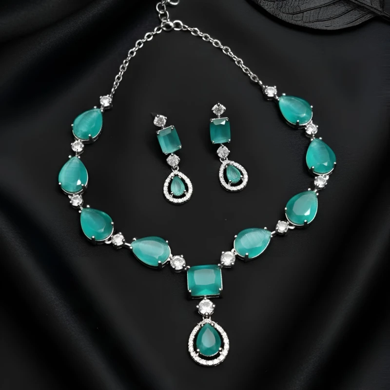 The jewellery uses AD stones (Artificial Diamonds) and not American Diamonds. These AD stones feel lightweight and gentle on the skin. They also deliver long-lasting shine. The black and silver tone combination adds a rich and luxurious appearance. This contrast makes the set stand out at every event.