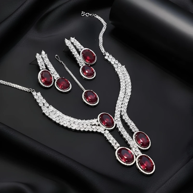 The Exclusive AD Partywear Necklace Set showcases a stunning blend of modern elegance and traditional bridal charm. Crafted with high-quality American Diamond stones, this necklace set delivers exceptional brilliance and a luxurious finish. Moreover, its refined detailing enhances the overall royal appeal, making it a standout accessory.